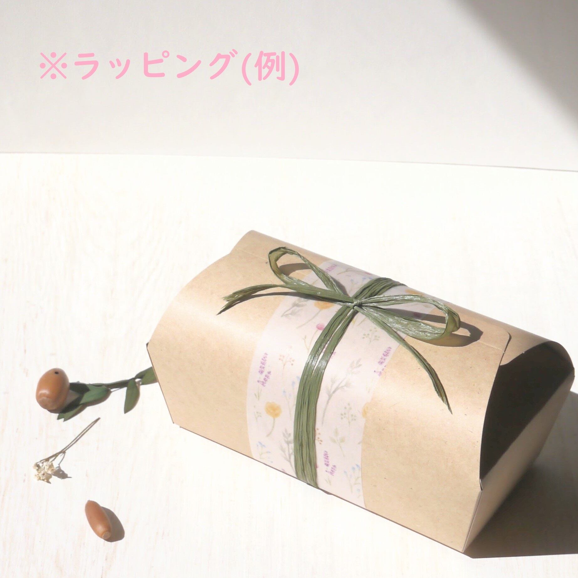 ・ラッピングをご選択いただいた場合は、お箱に入れてかわいい模様のグラシン+リボンで飾った状態でお届けいたします。